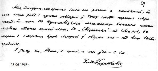 “Мы, беларусы, ганарымся яго імем разам з палякамі, бо гэта нашы рэкі і пушчы закінулі ў душу паэта першыя іскры паэзіі, бо гэта ад туганавіцкага няшчаснага кахання пачалі спяваць струны яго ліры, бо “Свіцязянка” – ад Свіцязі, бо мерны і пагрозны крок гісторыі ў творах яго - ад веж Наваградскіх.